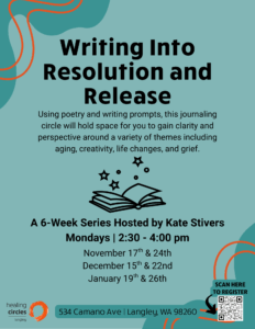 This 6-week journaling circle will use poetry and writing prompts to hold space for you to gain clarity and perspective around a variety of themes including aging, creativity, life changes, and grief. To learn more and register for this circle, please click HERE.