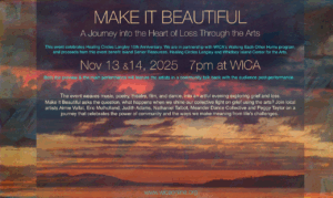 At its core, Make it Beautiful asks: What happens when we shine our collective light on grief using the arts? Join local artists — Aimie Vallat, Eric Mulholland, Judith Adams, Nathaniel Talbot, Meander Dance Collective, and Peggy Taylor — as they guide audiences through a creative journey that celebrates the power of community and the ways we make meaning from life’s most difficult challenges.